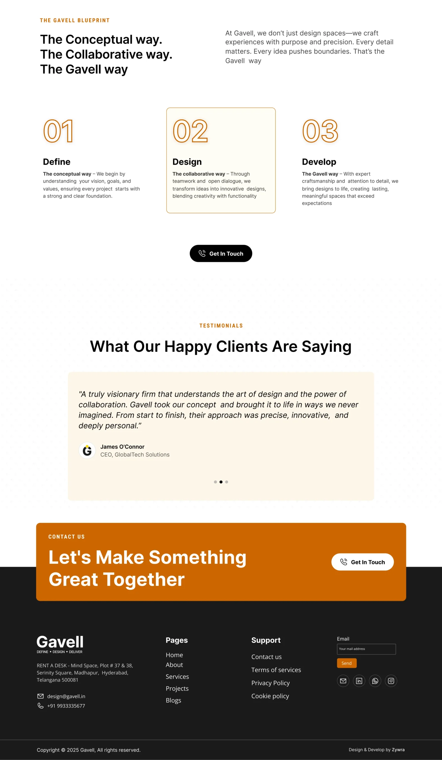 Gavell is a modern interior design and space-planning studio that blends functionality with refined aesthetic sensibilities. The vision for this project was to create a digital space that reflects Gavell’s design philosophy — elegant, structured, warm, and deeply thoughtful. The website needed to communicate the studio’s expertise in interior, exterior, and architectural design while offering a seamless browsing experience for potential clients.
